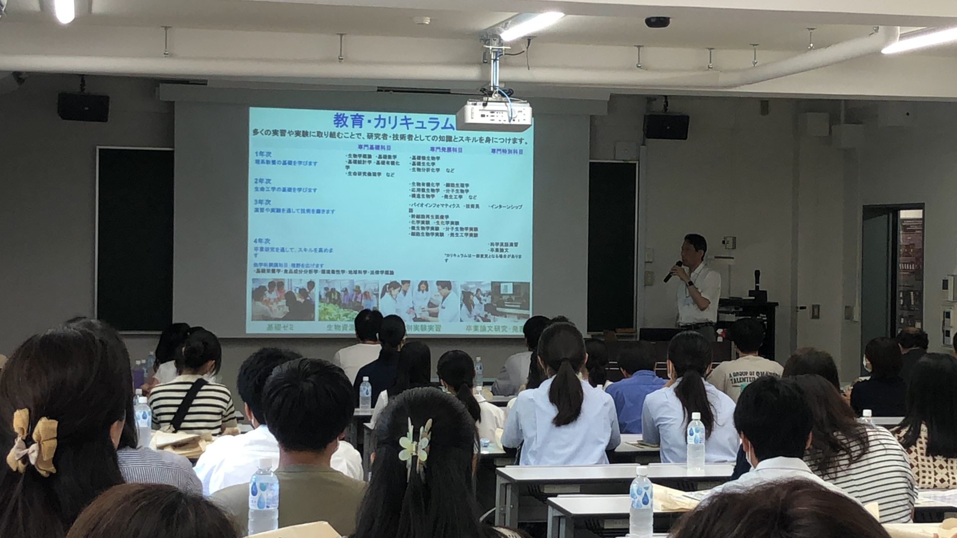 生命環境学部では、午前・午後の2部制で、各学科ごとに学科紹介、研究紹介、施設見学、ミニ実験、模擬講義、大学生活紹介、保護者向け説明等を行いました。 また今年度は、ご参加いただいたみなさまに喜んでいただけるよう、附属農場で収穫した果物や野菜、新たに作成した学部グッズ(多機能ボールペン)を配布しました。