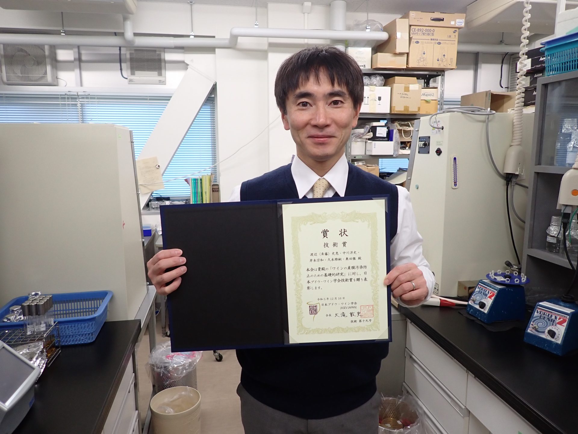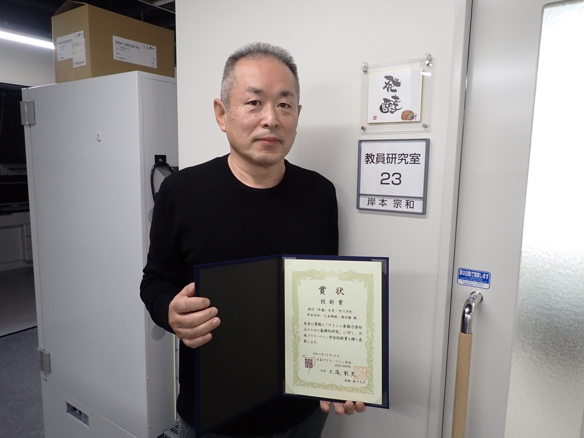 ワイン醸造で問題となっている産膜汚染(微生物汚染)の抑制に向けた基礎研究で、今後の日本ワインの技術を根幹から支える研究であると評価され技術賞を受賞しました。