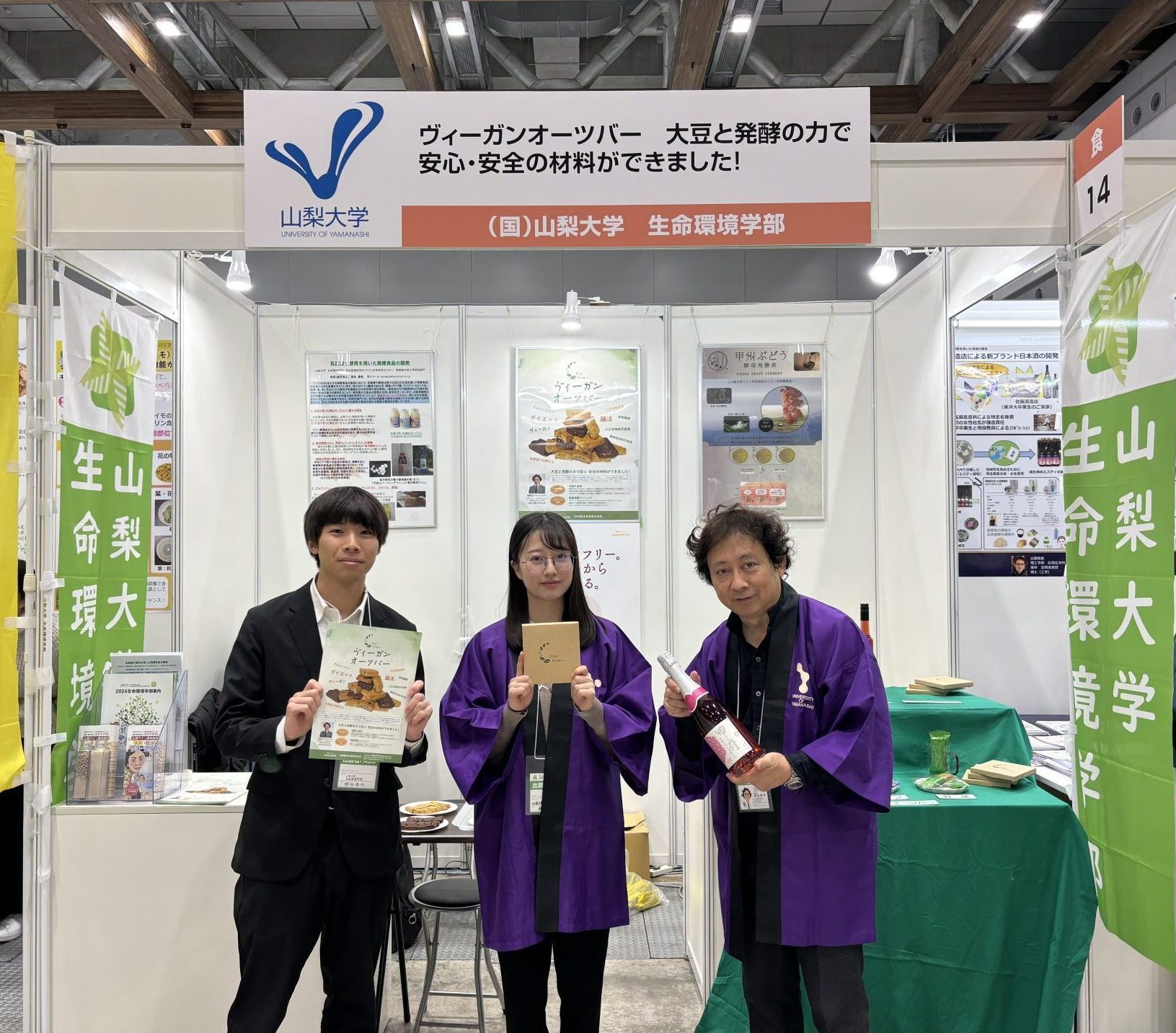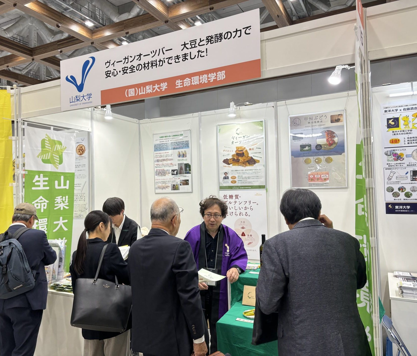 11月20日(月)~22日(水)の3日間、東京ビックサイトにおいて、「アグリビジネス創出フェア2023」が開催され、地域食物科学科 柳田藤寿教授が食品ゾーンにブースを出展しました。ブースへご来場いただいた方には、白州屋まめ吉(山梨県北杜市)と共同開発したヴィーガンオーツバーや大豆で作った飲むヨーグルトをご試食いただき、『おいしい、食べやすい』『腹持ちが良さそう!』といった感想をいただきました。