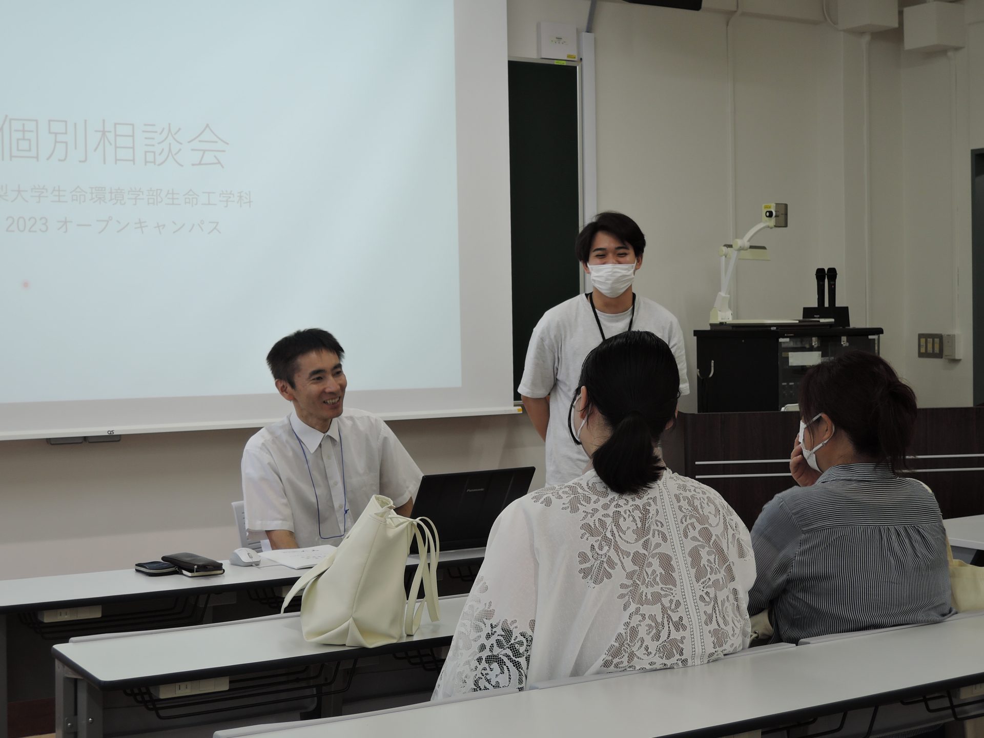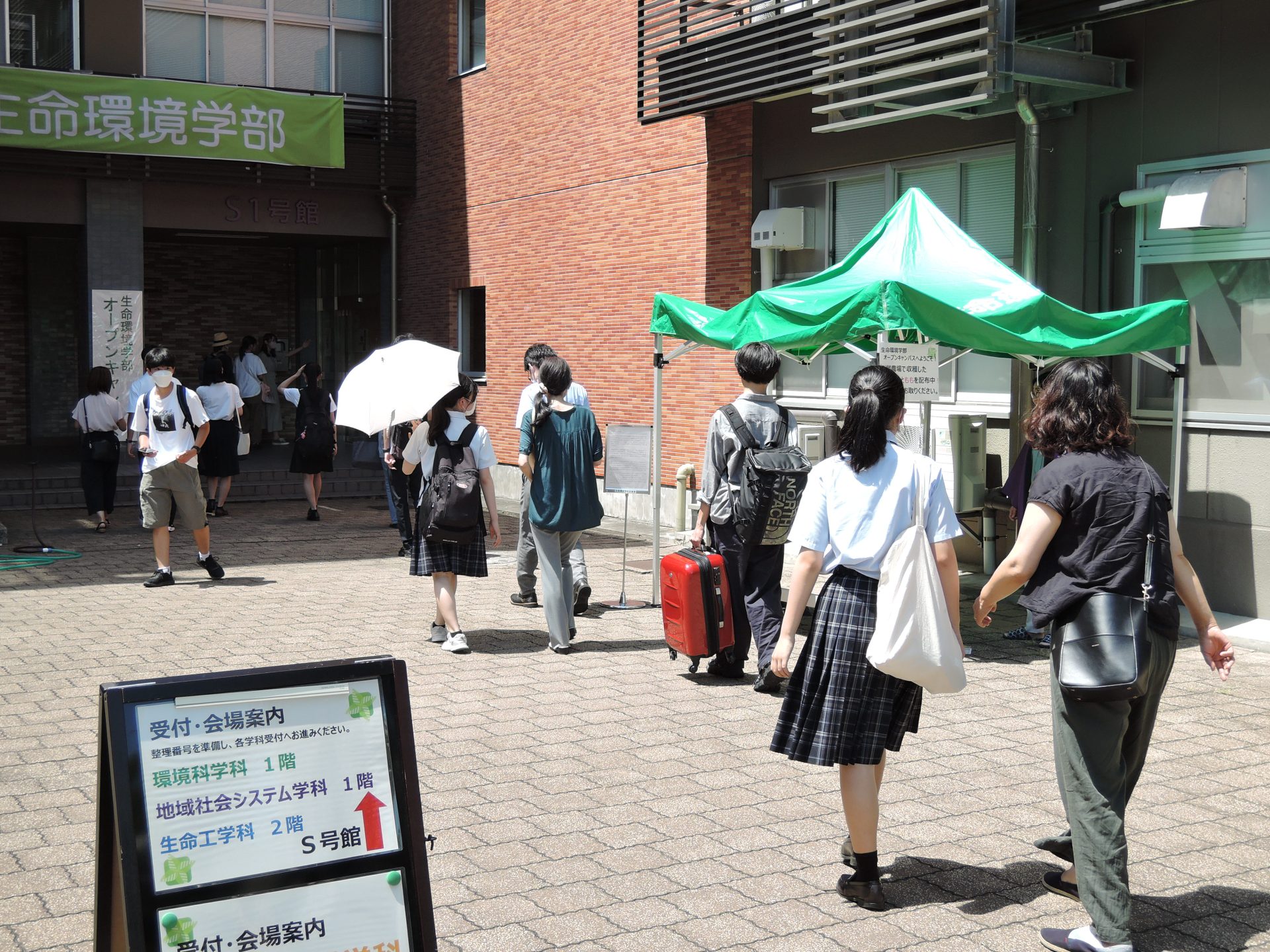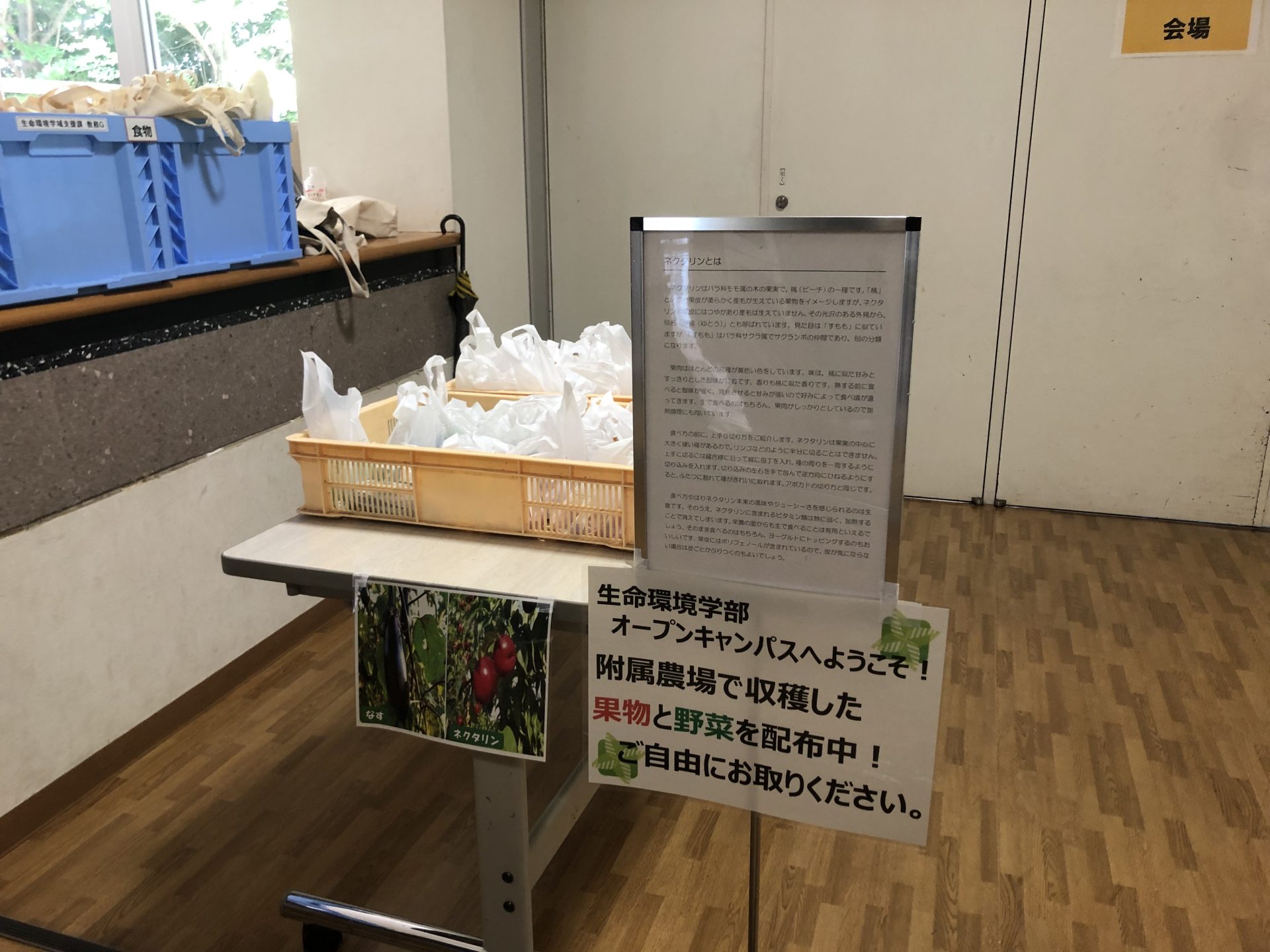 生命環境学部では、午前・午後の2部制で、各学科ごとに学科紹介、研究紹介、施設見学、ミニ実験、模擬講義、大学生活紹介、保護者向け説明等を行いました。 また今年度は、ご参加いただいたみなさまに喜んでいただけるよう、附属農場で収穫した果物や野菜、新たに作成した学部グッズ(多機能ボールペン)を配布しました。