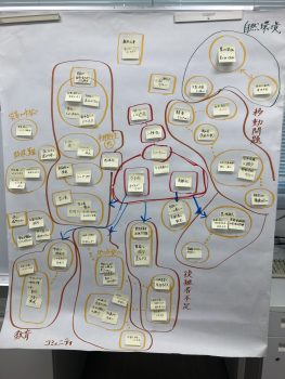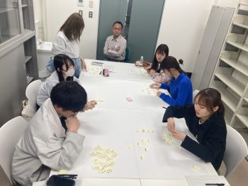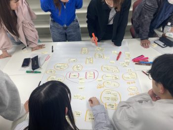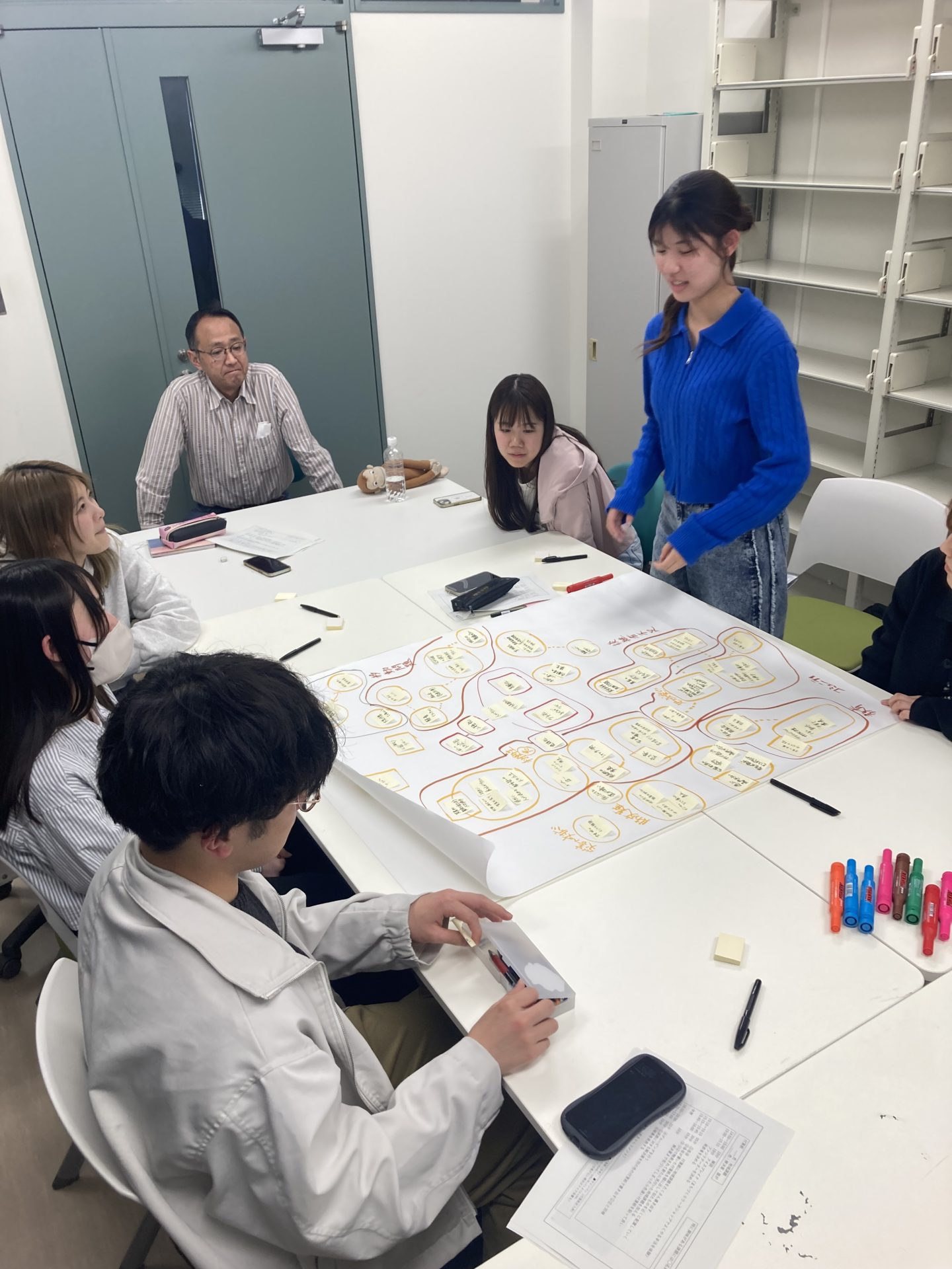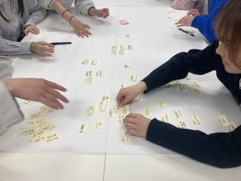 学生たちにとっては初めてのKJ法による授業でしたが、それぞれが意見を出し合い、ファシリテーター(場の進行と意見調整役)となった学生を補助し、意見を上手くまとめる様子が見られました。ファシリテーターの役割をこなすことは実践現場でも大いに役に立つ能力であるため、今後もKJ法によるディスカッションなどの機会を増やし、経験を積んでもらうことを目標としています。