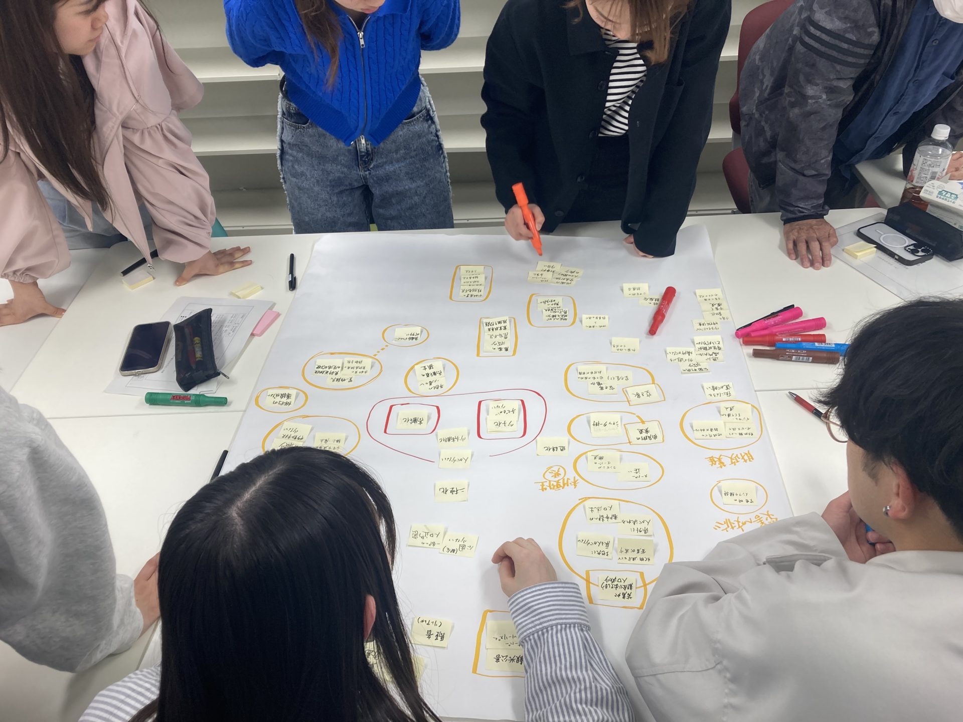 KJ法は本質的な問題解決策の発見やアイデアを生み出すことができる手法とされており、グループ作業でアイデアを出し合い、それぞれ頭の中を整理するといった作業の体得が期待されます。
