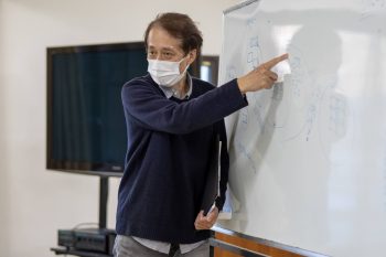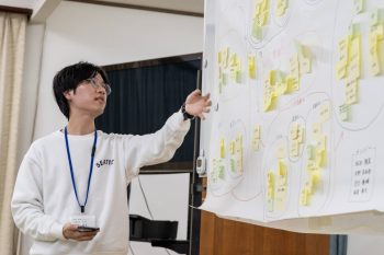合宿1日目は北杜市の研修施設「伊予ロッヂ」において、本学名誉教授・大山勲先生の指導によるワークショップ「地域課題とは何か? ~KJ法による分類整理の演習~」が行われました。「KJ法」とは、本質的な問題解決策の発見やアイデアを生み出す手法とされており、グループ作業で意見を出し合い、各々の頭の中を整理するといった思考力の向上が期待されます。