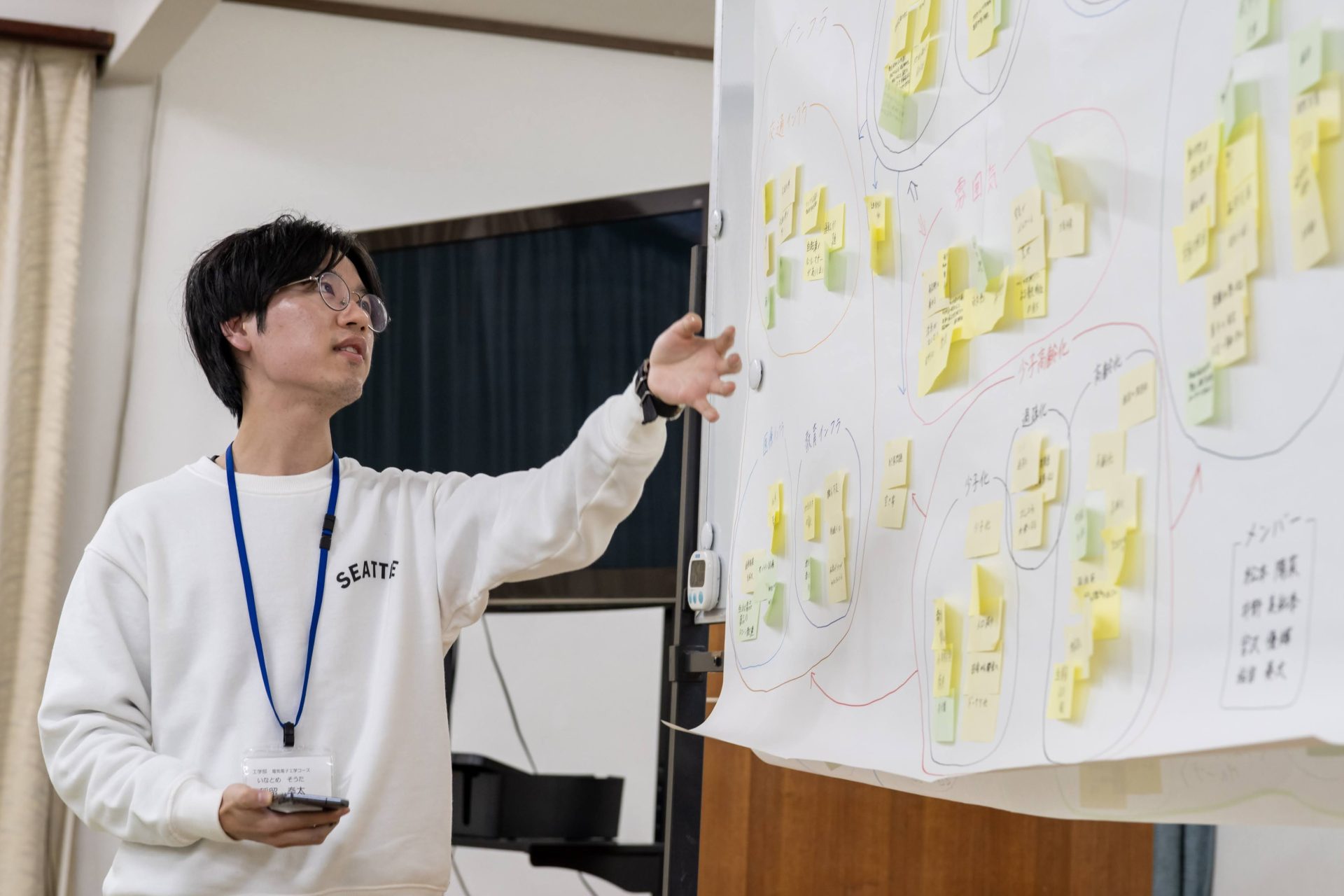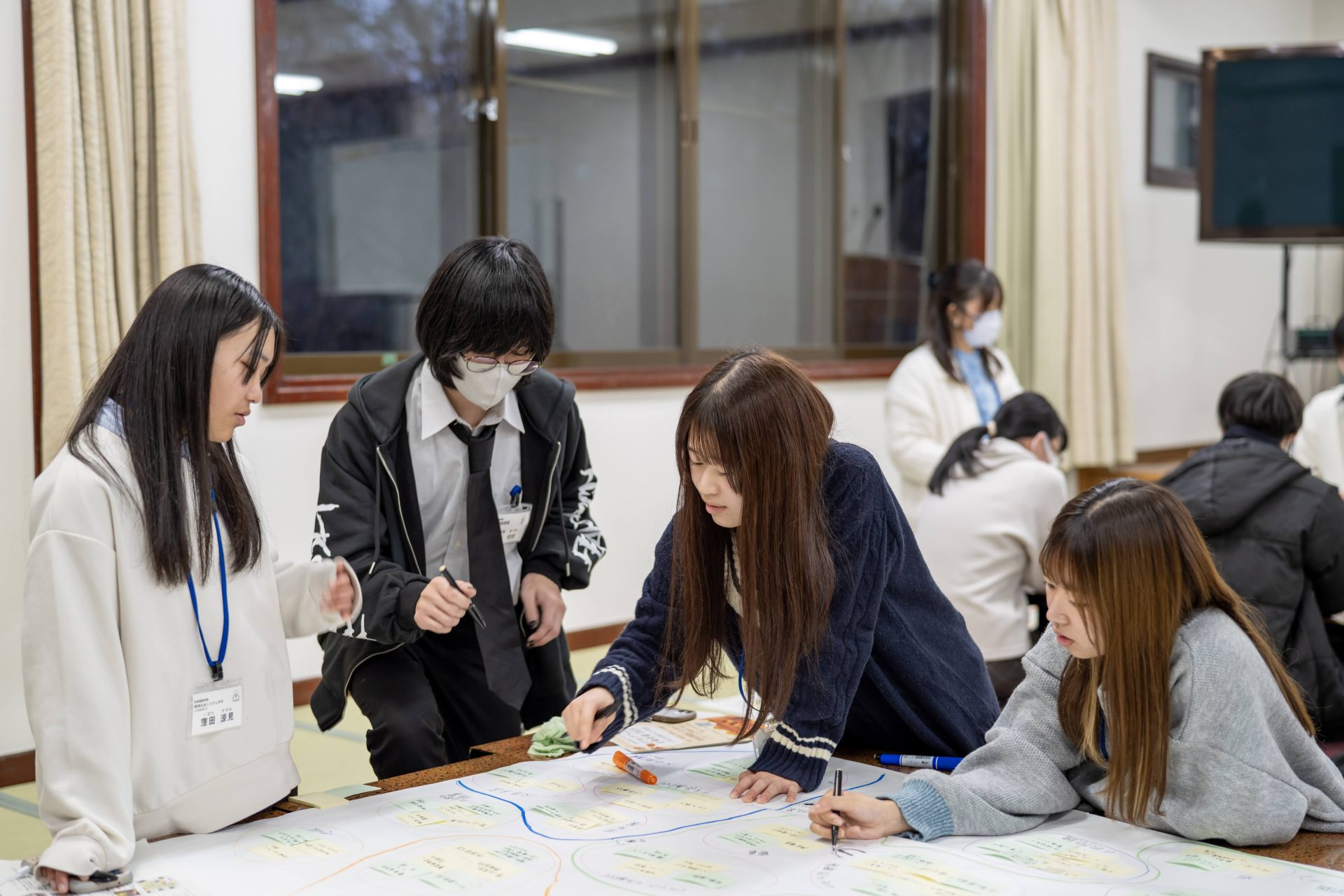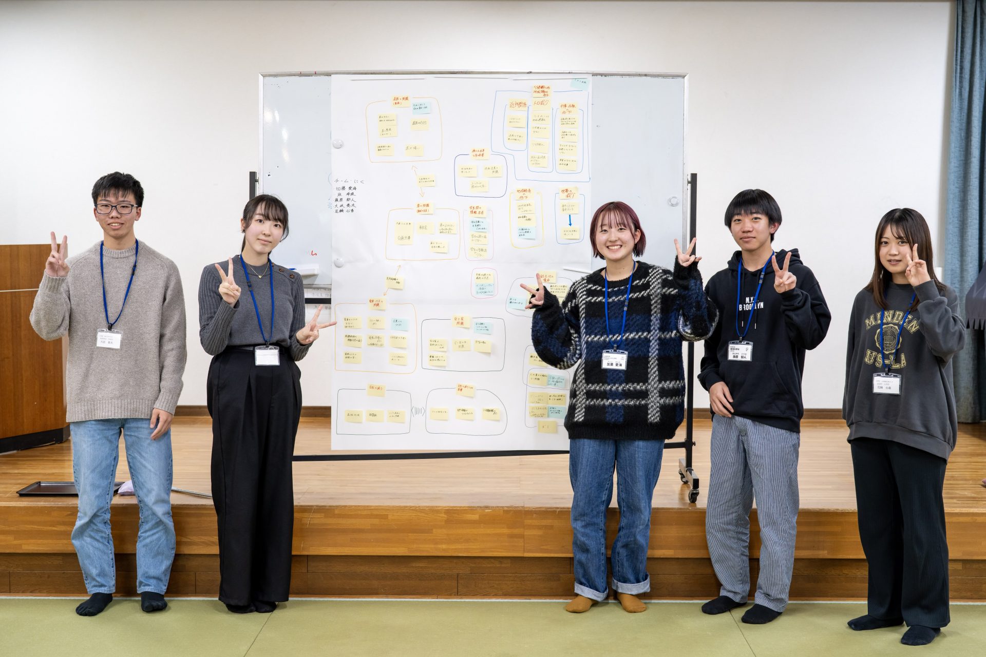 本合宿は、プログラムの枠を超えて多くの人たちと交流することで地域課題について理解を深め、広く社会を俯瞰で捉えることを主な目的としており、一泊二日の行程で「KJ法」ワークショップ研修と周辺地域の視察活動が実施されるものです。