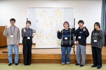 実際に学生たちは3プログラムが混在した7つのグループに分かれ、“初めまして”の人たちのなかでも気後れなしにファシリテーター(場の進行と意見調整役)となった学生をフォローしながら活発に意見を出し合い、グループごとに個々の知識を寄せ集め、さらには教員に聞き取りを行うなど工夫を凝らす様子が見られました。「地域課題の本質」を整理し、「地域課題の位置づけ」をまとめ上げ、最終プレゼン発表会では、それぞれの個性が存分に発揮され、爆笑を誘うなど大変な盛り上がりを見せました。